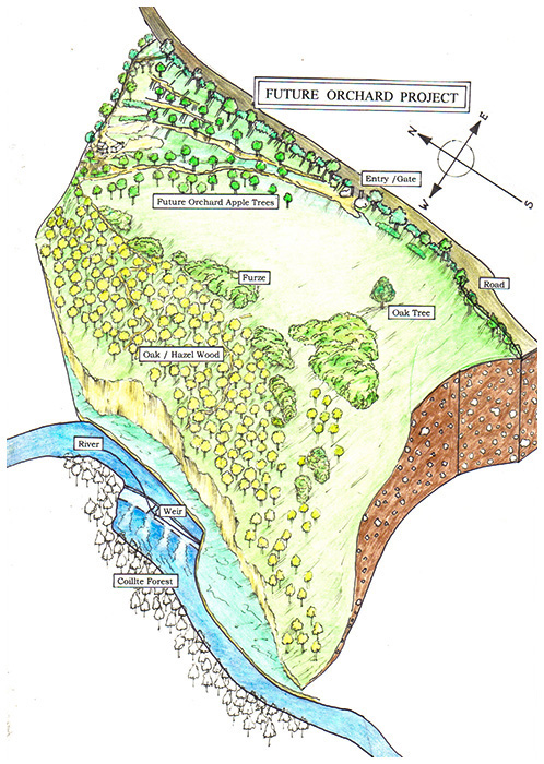 Our land is mainly sloped and is bounded by the Glashaboy River to the West and the R616 to the East. The river has a weir across it and care should be taken particularly in this vicinity. A cliff overhangs the river. The height varies - it is about 10 meters at its highest point.
